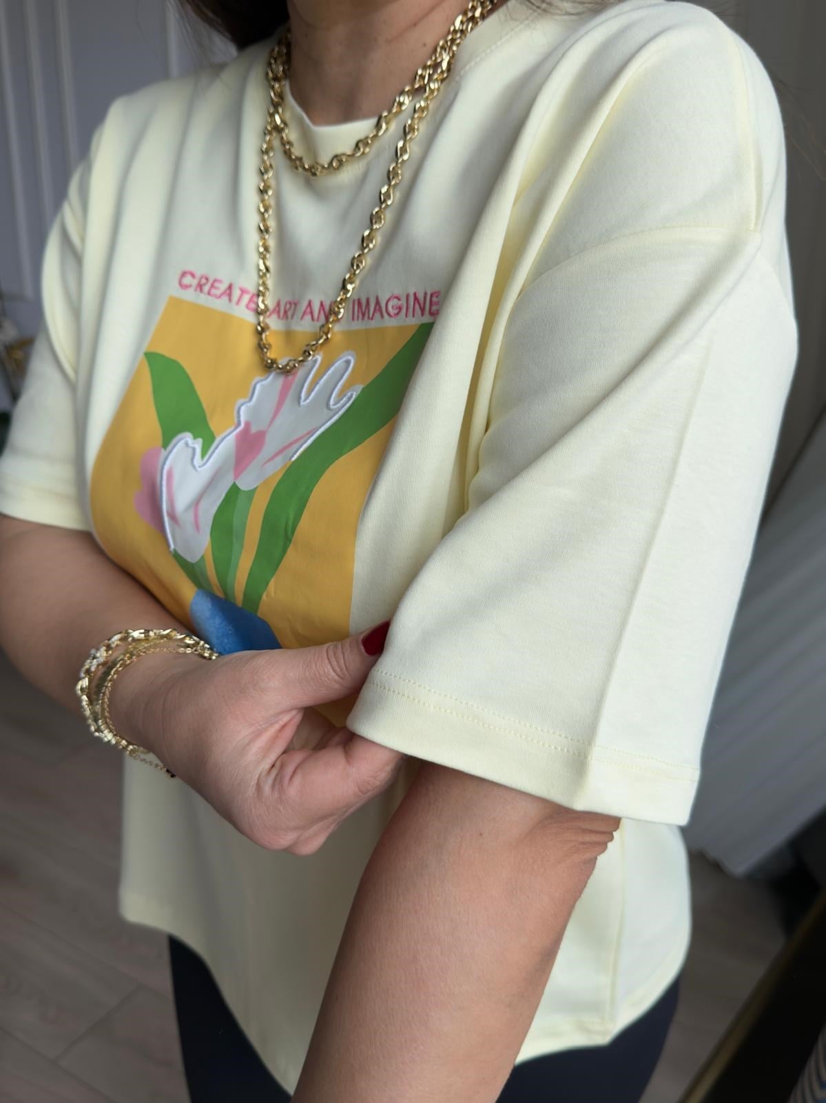 Bisiklet Yaka Çiçek Desenli Pamuklu T-Shirt Sarı