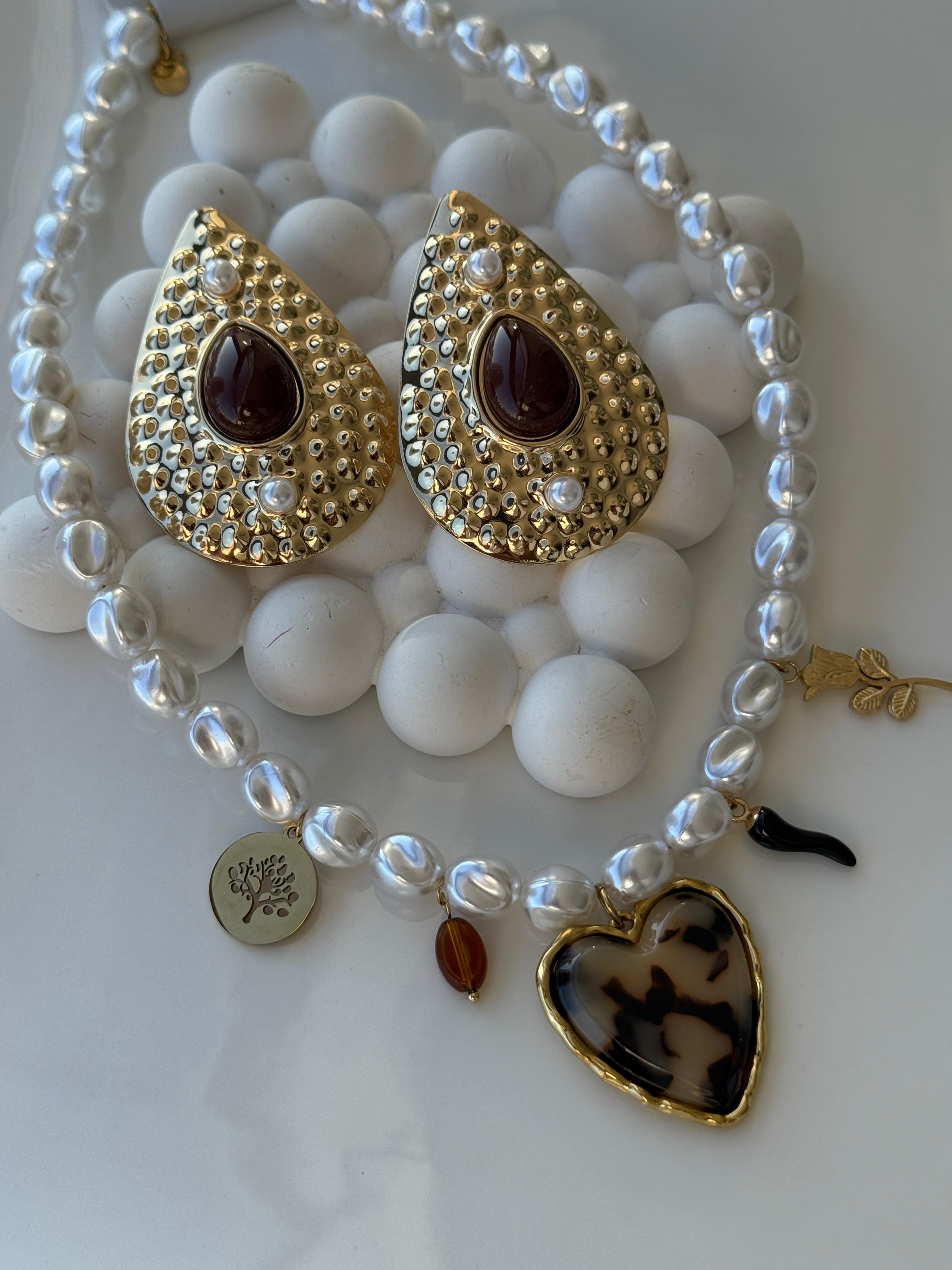 Özel Seri İncili Leoparlı Kalp Kolye Küpe Kombini